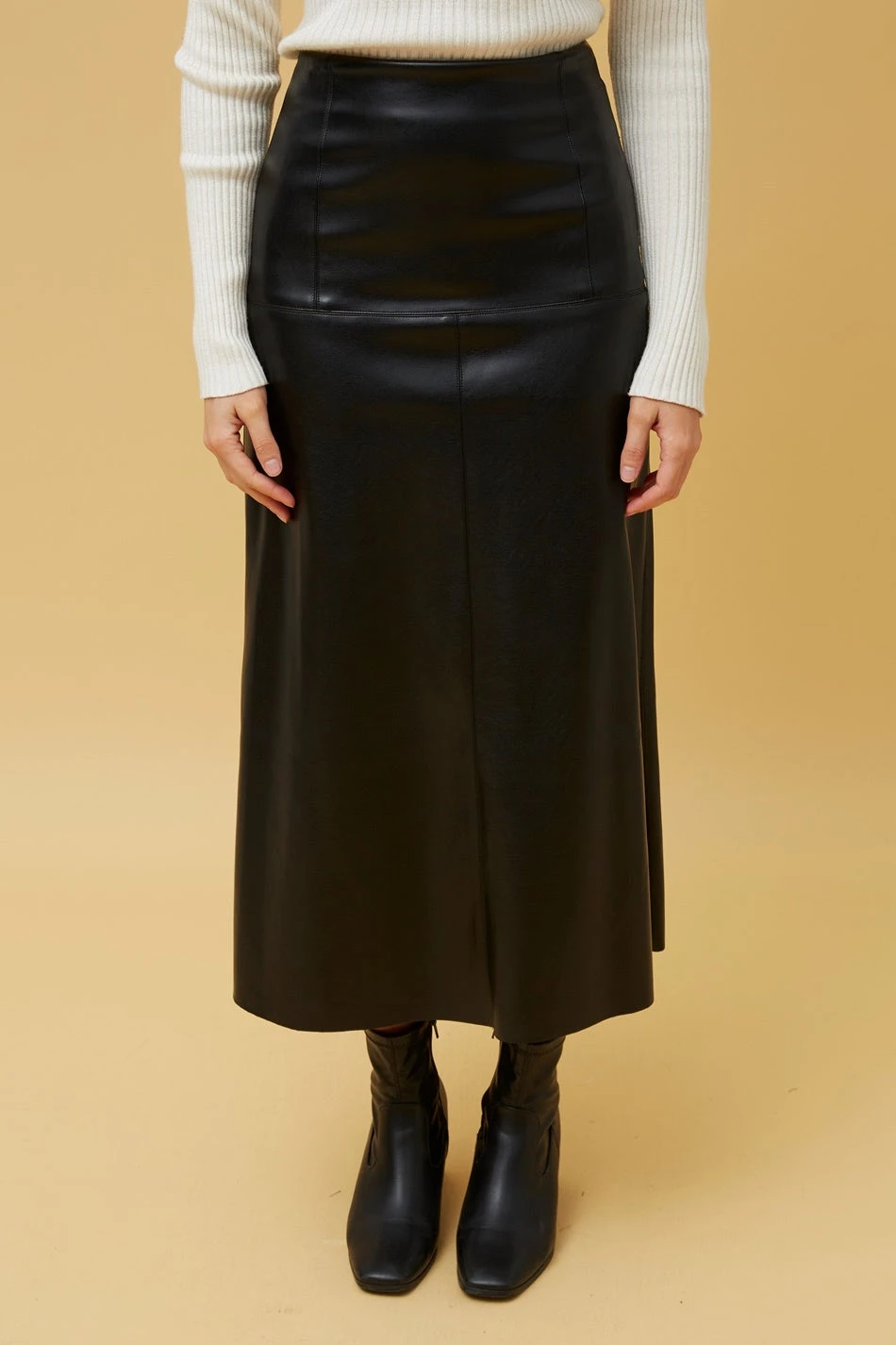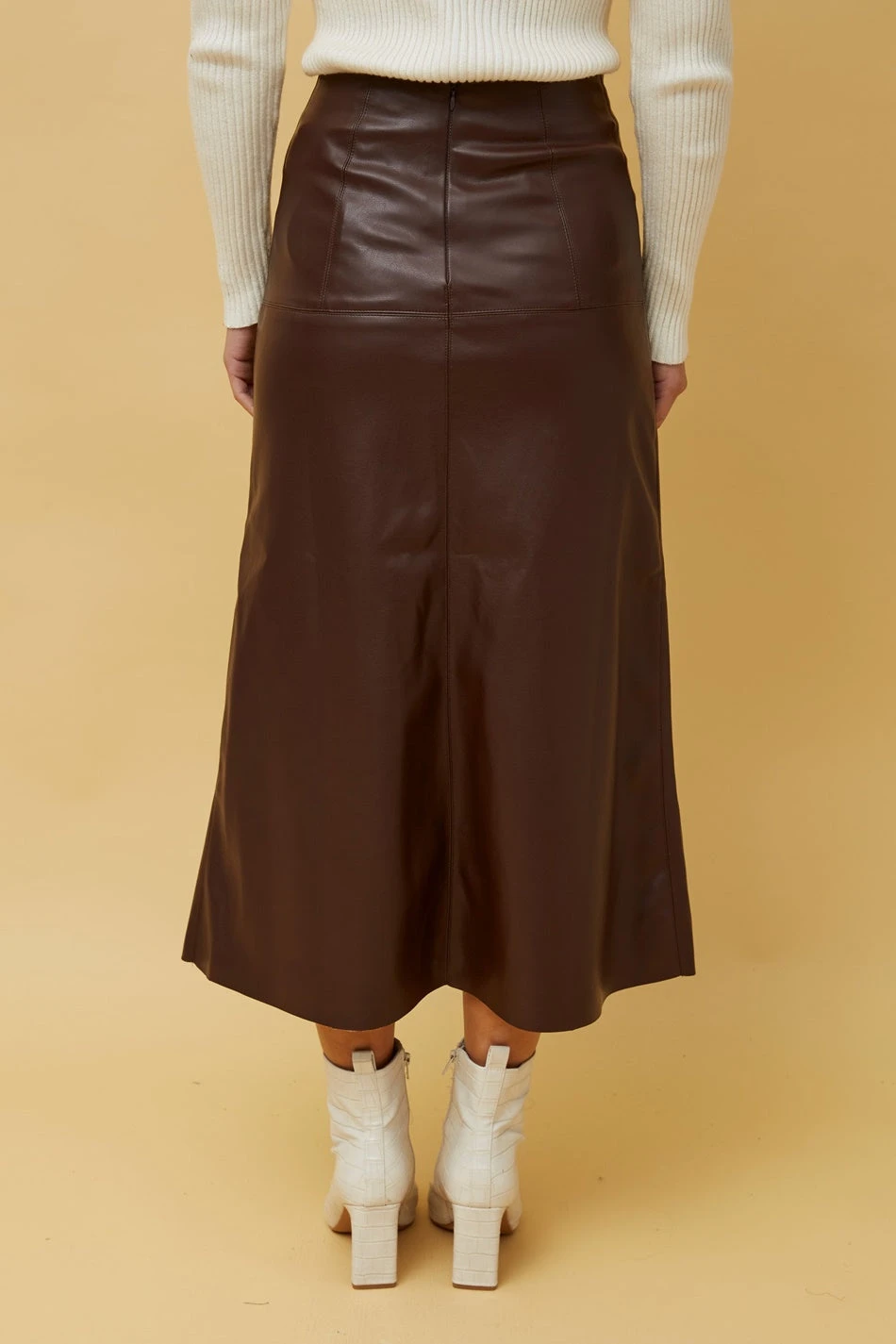 A luxe vegan leather shapes the Aubree Vegan Leather Skirt. It features a bold, high-waistline, maxi-length hem and panel details that create a softly fluted feminine silhouette.