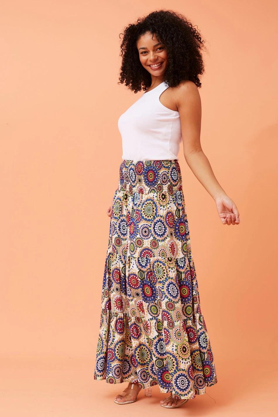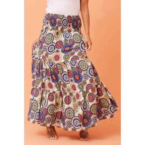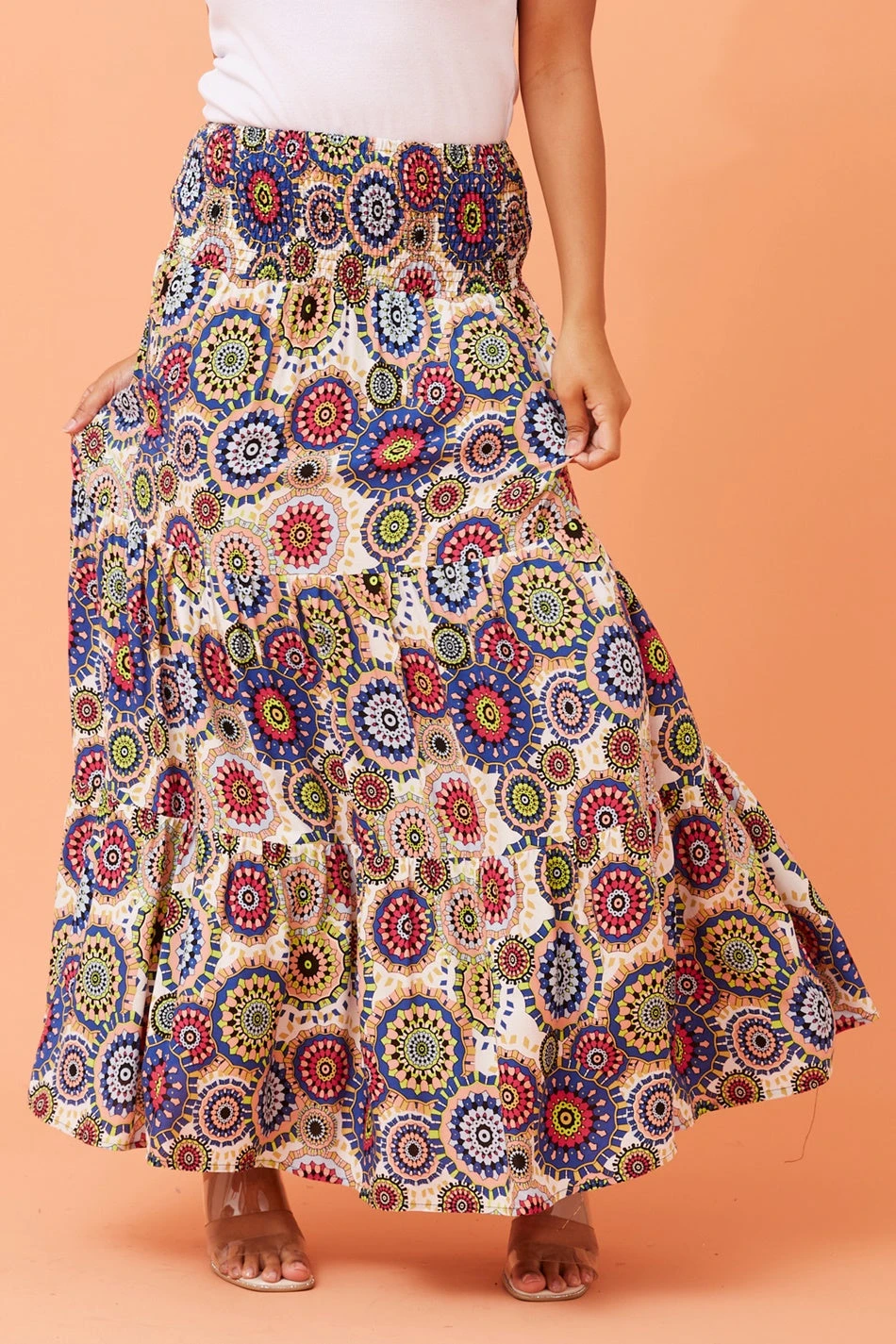 Our Bettina abstract boho print tiered skirt is a gorgeous addition to any wardrobe. Style with a blouse and heels for an elegant and stylish office look or style with a statement graphic tee and heeled boots for an elevated chic look!