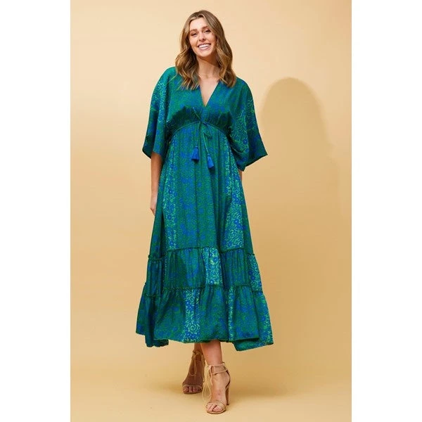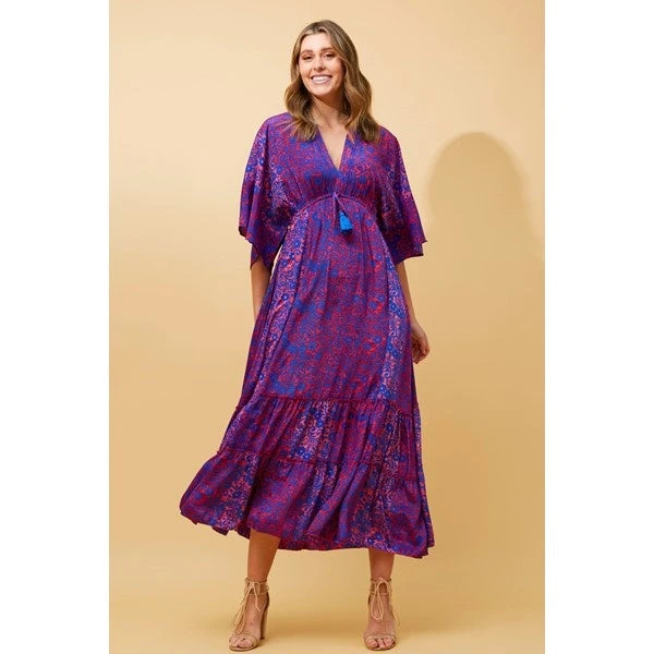 The Chandra dress has a lightweight look as it descends to maxi length, where the cinched in waist with ties work to add further appeal. Beautifully made in India, the dress offers a relaxed design with 3/4 sleeves and dramatic V shaping front and back creating an effortless allure.