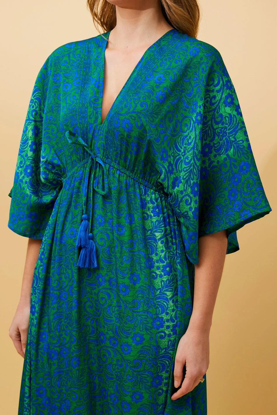 - Deep V back with border print and self fabric ties with tassel details