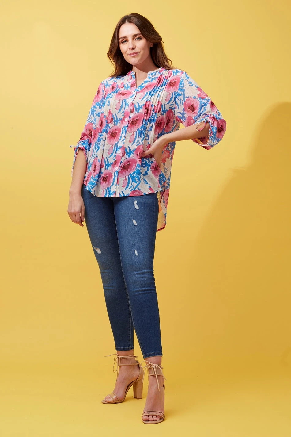 This floral pleated blouse will keep you looking fresh & stylish all season long with its soft semi sheer fabric and button up front that can be worn open or closed. Match this lovely top over a denim or 3/4 capris and a summer hat.