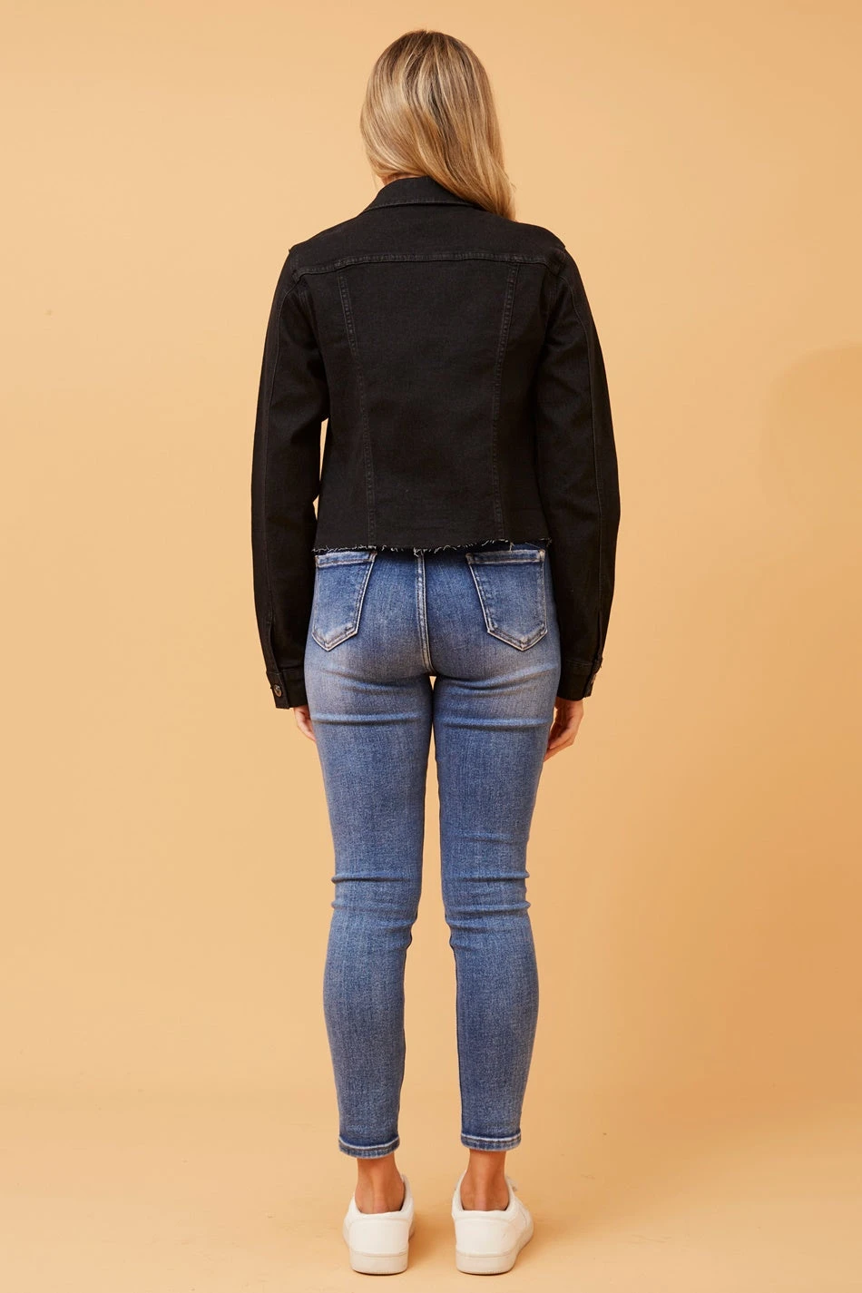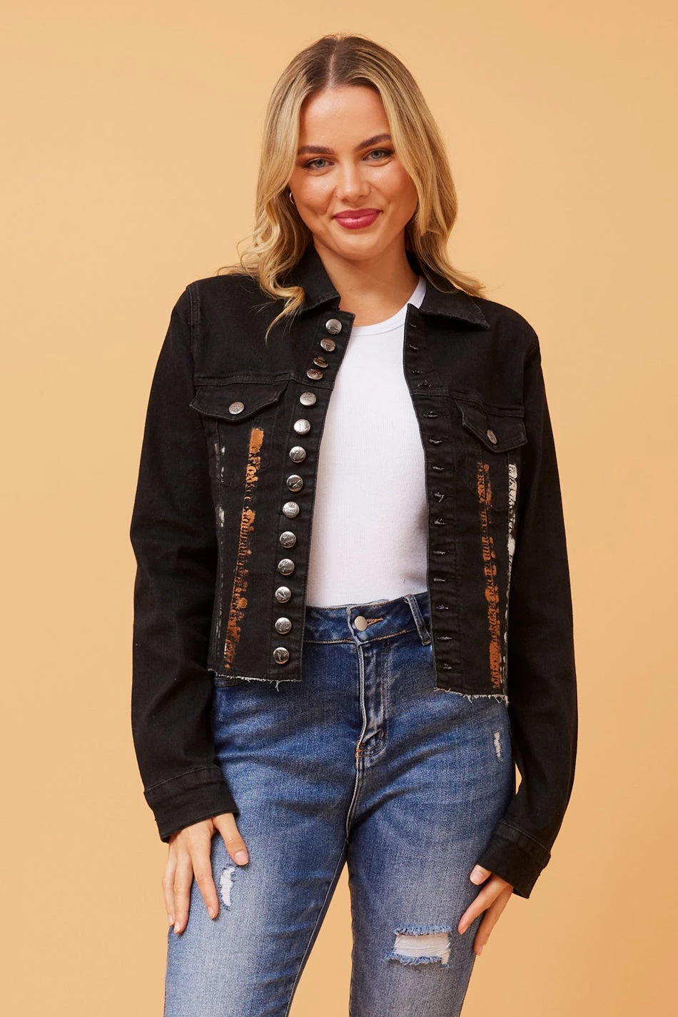 This sophisticated jacket boasts a sleek black canvas adorned with a mesmerizing foil print, adding a touch of glamour to your ensemble. The long sleeves provide both style and warmth, making it a versatile choice for day-to-night transitions.