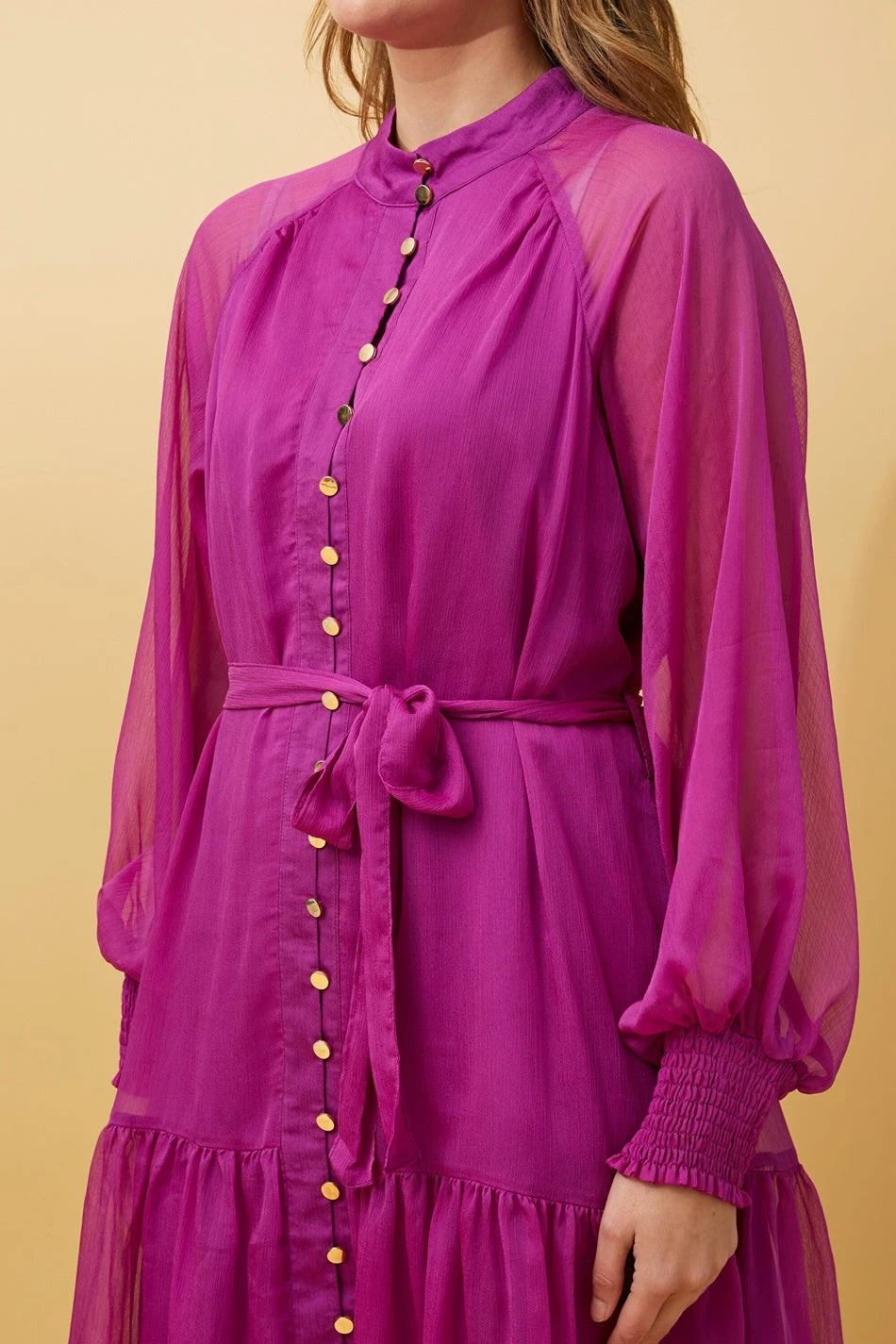 • Long sheer balloon sleeves with shirred elastic cuffs