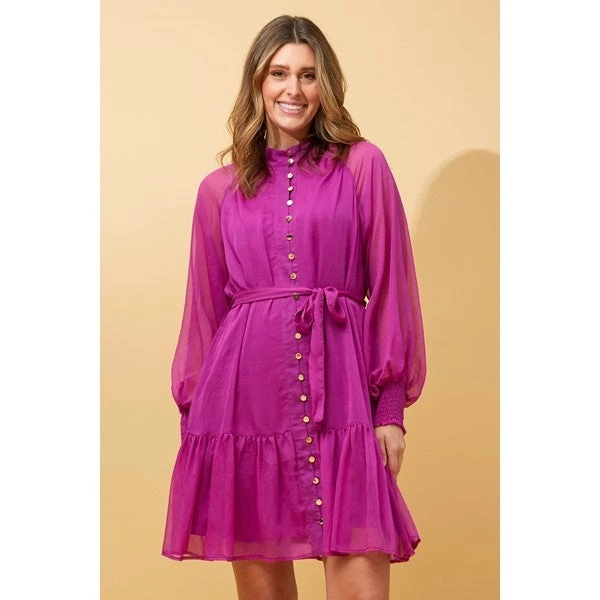 Our Illaria button front short dress is the perfect dress to wear to stand out from the crowd. Make it a night to remember in this chiffon dress featuring a semi-sheer design, high neck, button front, long balloon sleeves, a flounce hem, and A-line silhouette. Wear it to a party with heels and statement jewellery to complement!