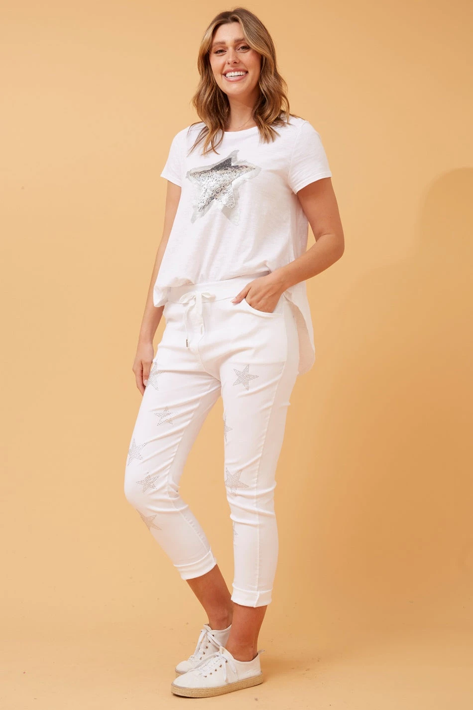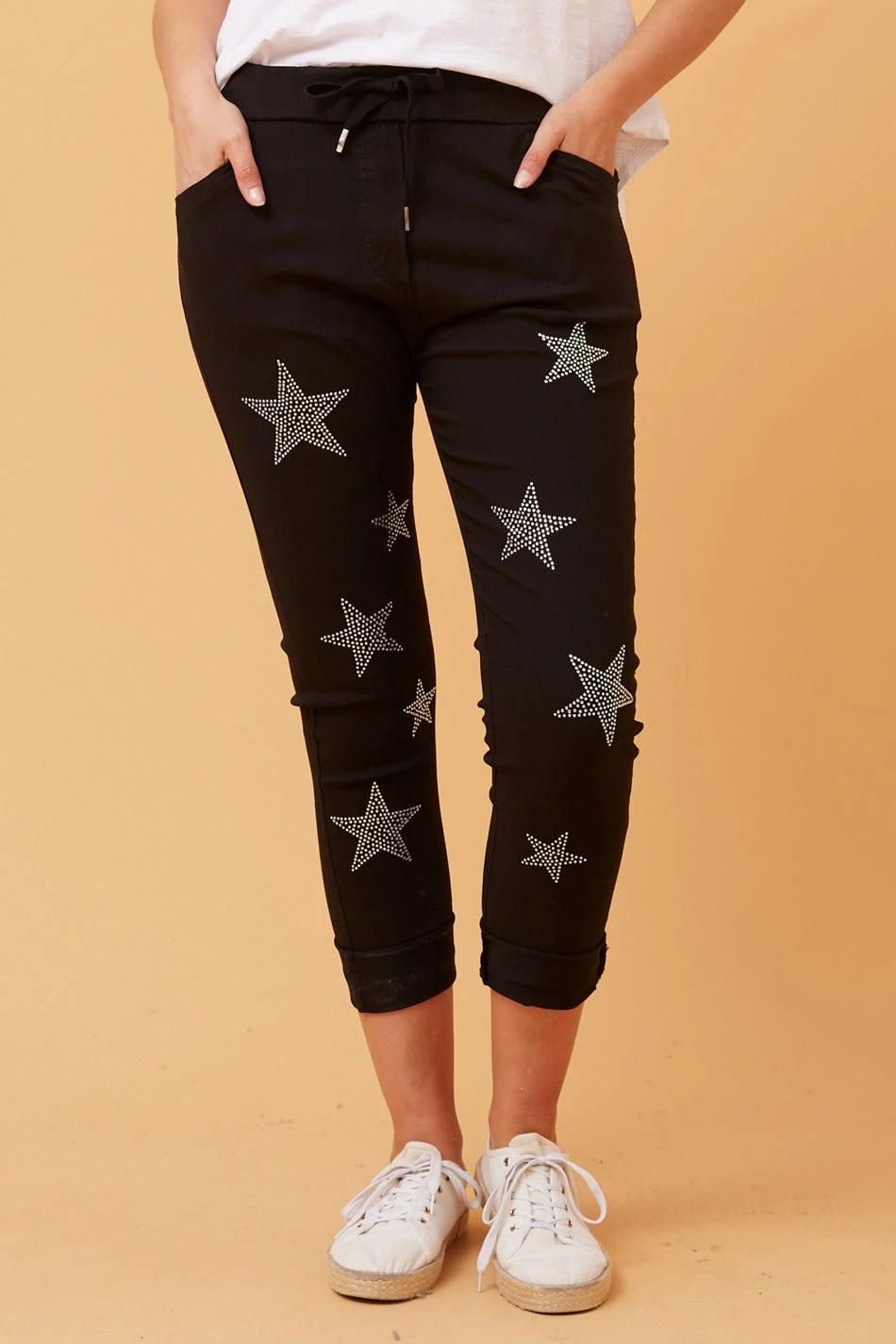 These embellished star print joggers are the kind of pants you will be living in all year round. Blending the casual-chic style of jeans with the easy comfort of joggers. Perfect for pairing with sneakers and a simple tee for that casual yet chic look.