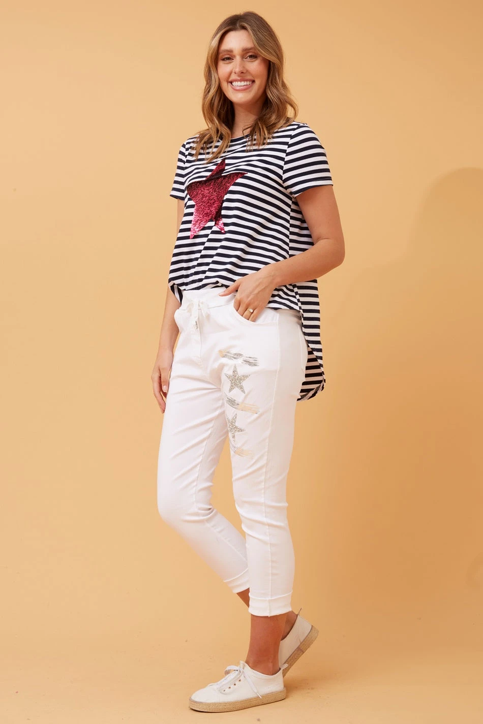 These sequin star print joggers are the kind of pants you will be living in all year round. Blending the casual-chic style of jeans with the easy comfort of joggers. Perfect for pairing with sneakers and a simple tee for that casual yet chic look.