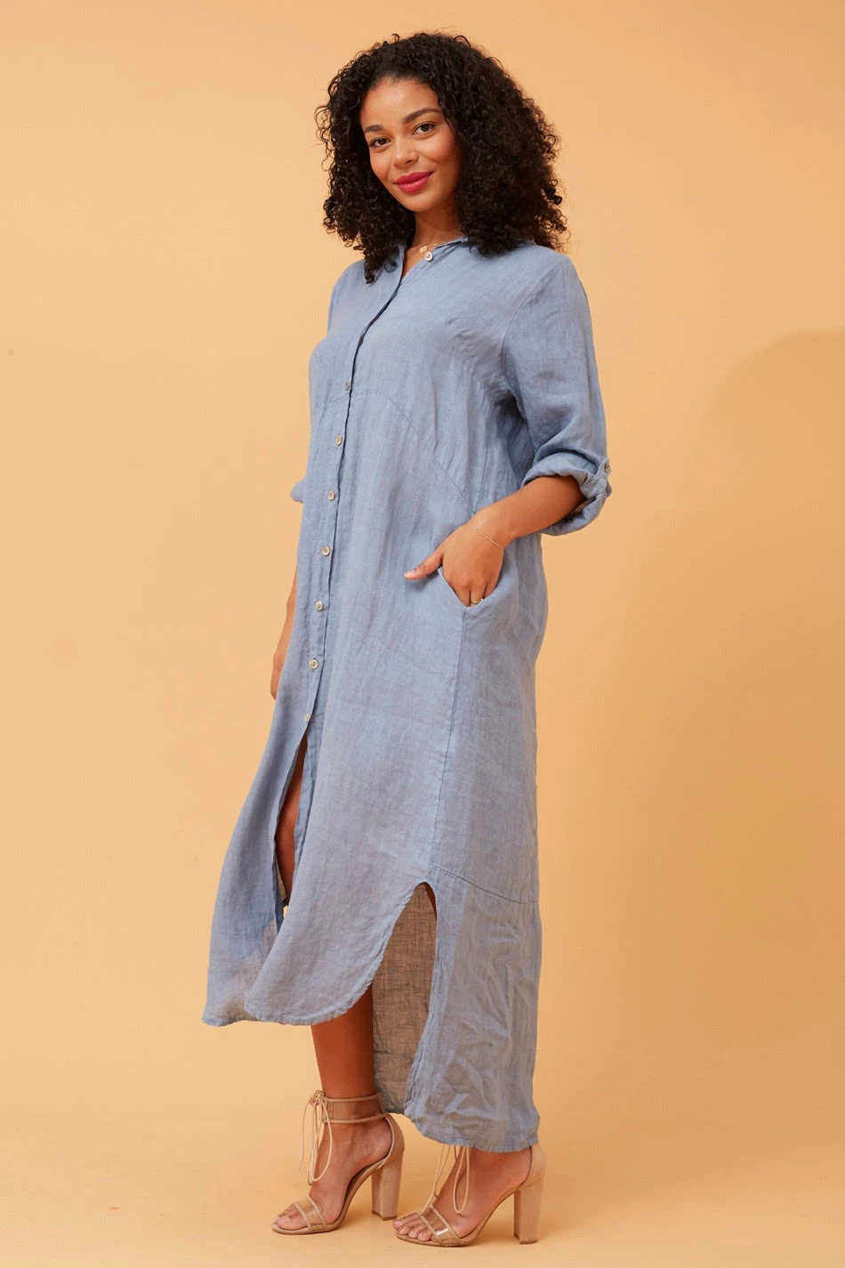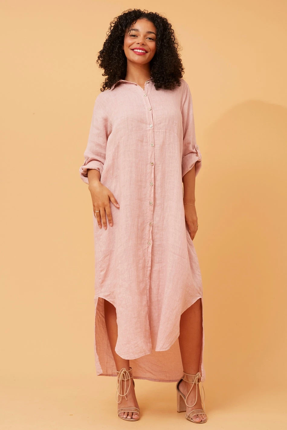 Welcome our most favorite style, effortless and versatile. Our Kimmy Button Front Linen Shirt Dress is a core wardrobe staple with modern, feminine finishing. Wear it buttoned up or style it open as a layering piece. Either way we are loving it!