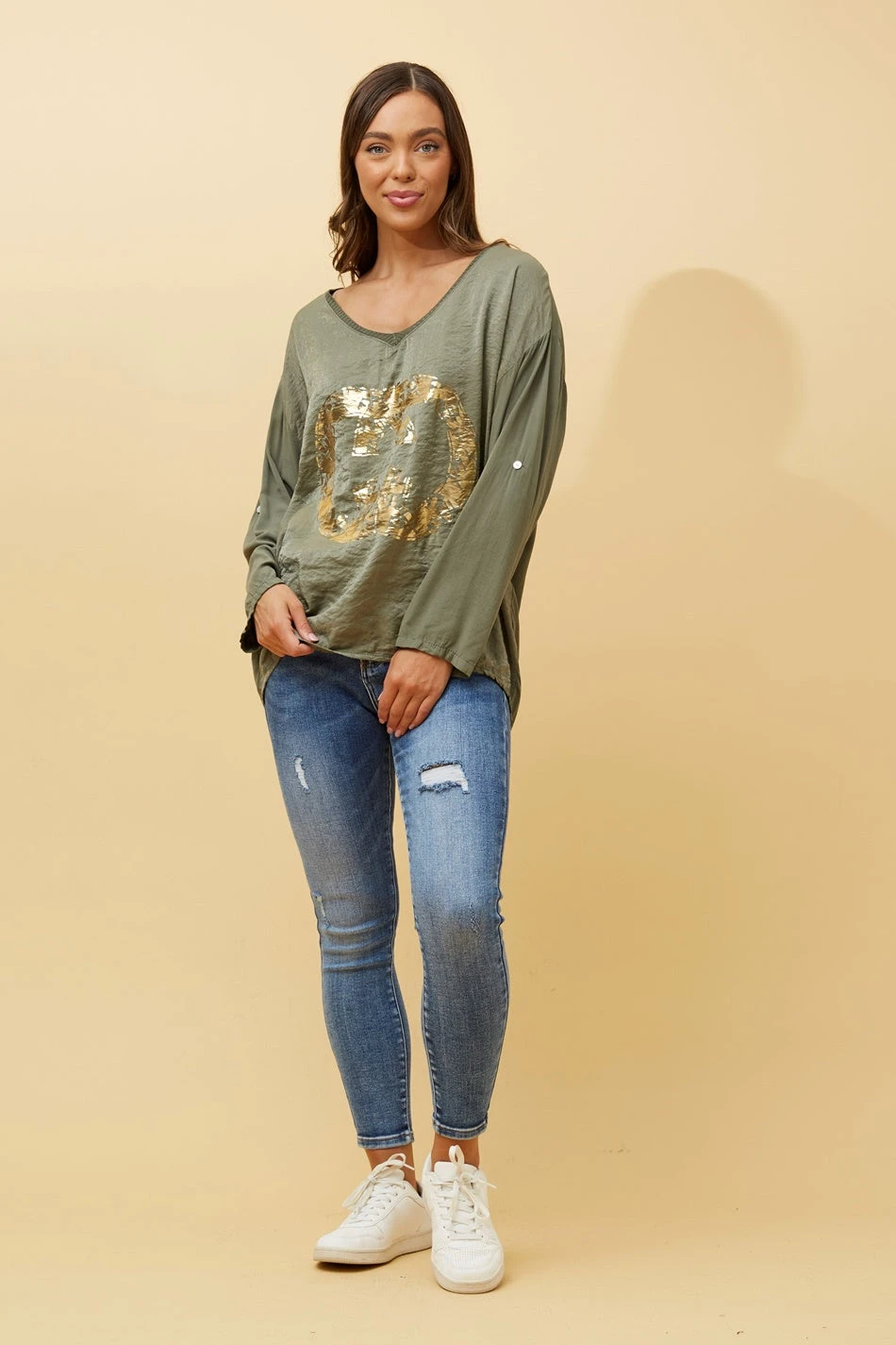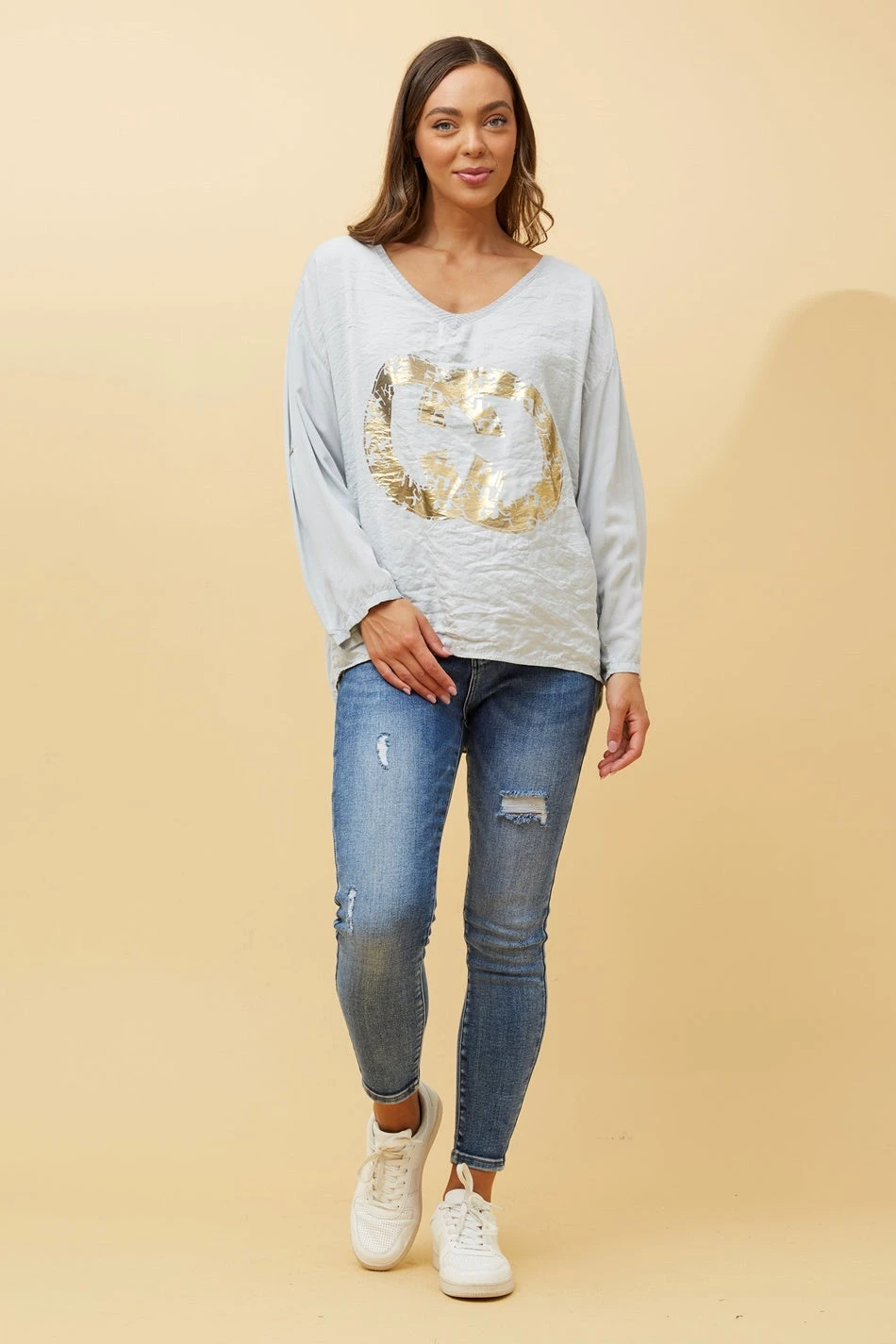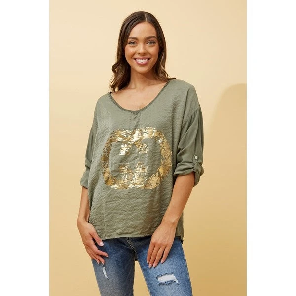 Featuring a shallow V neckline, foil graphic print and long roll-up sleeves, this Made in Italy is ideal for all casual day outs! Pair this with ripped jeans and sneakers for a comfy autumn/winter outfit!