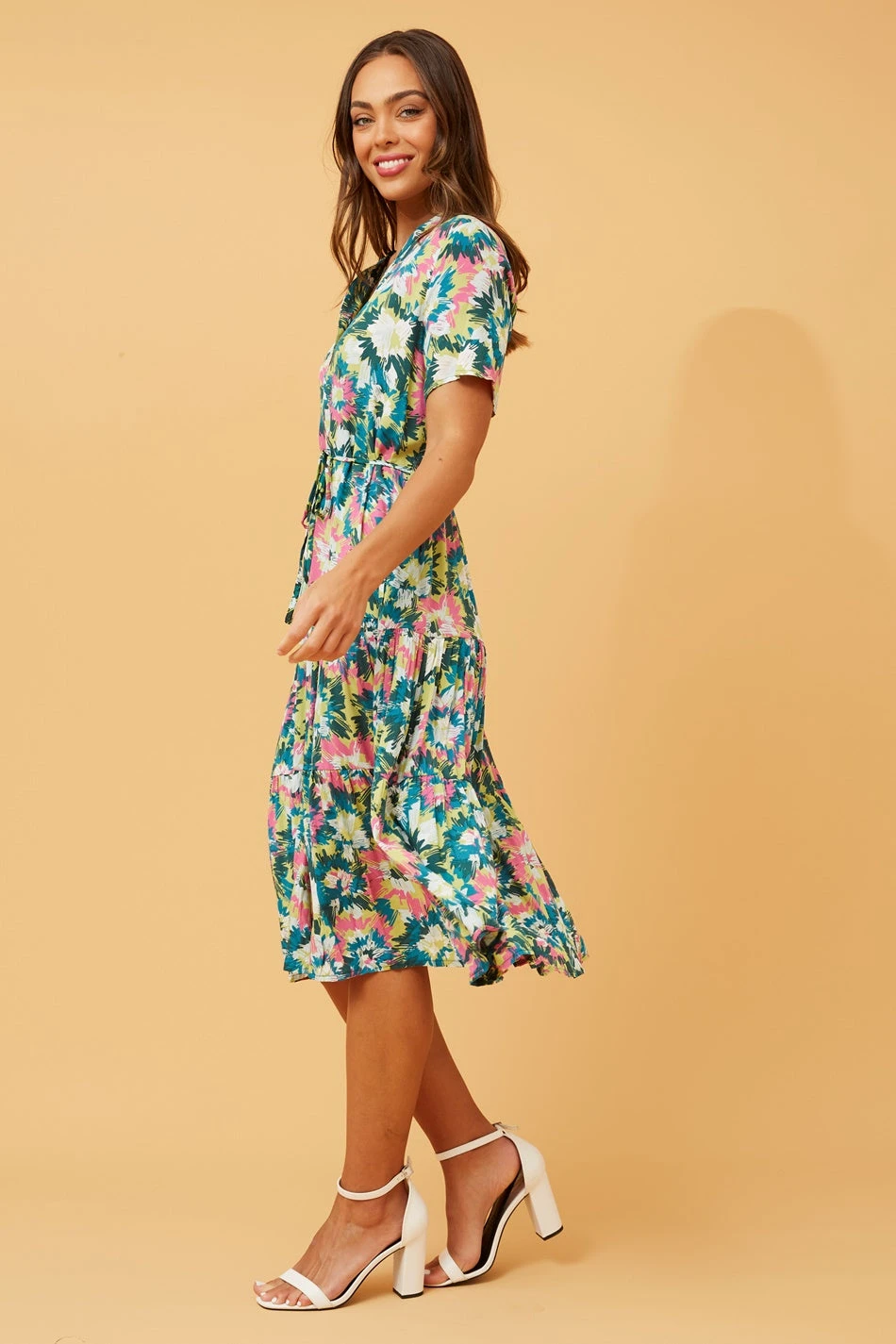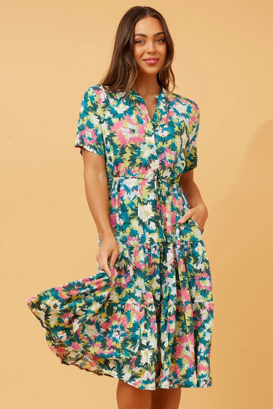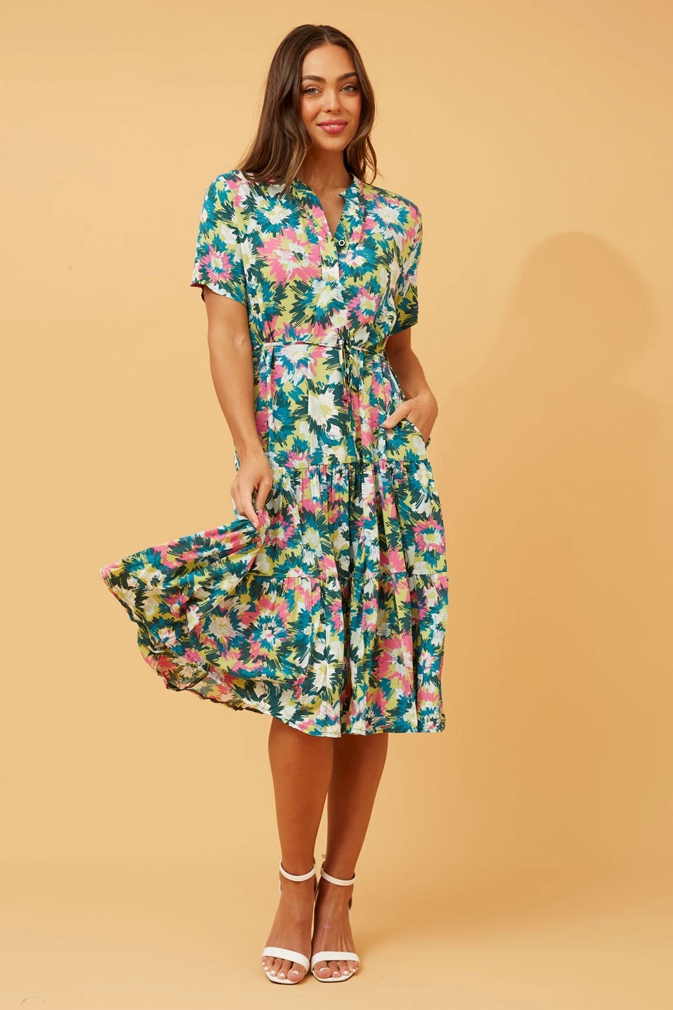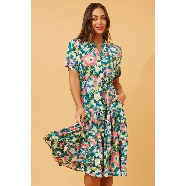 Embrace timeless elegance with the Mariella Floral Midi Dress—a versatile wardrobe gem. Featuring a Mandarin collar and a functional front button placket, this dress exudes effortless charm. Pair it with strappy sandals or sneakers for a casual day out.