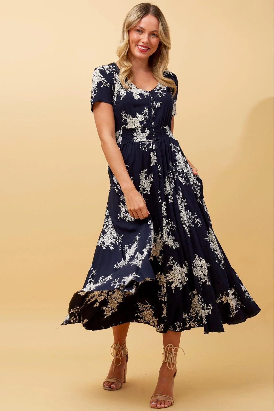 Add this easy to wear midi dress to your wardrobe for effortless styling. The delicate printed floral design gives you an effortless feminine style.