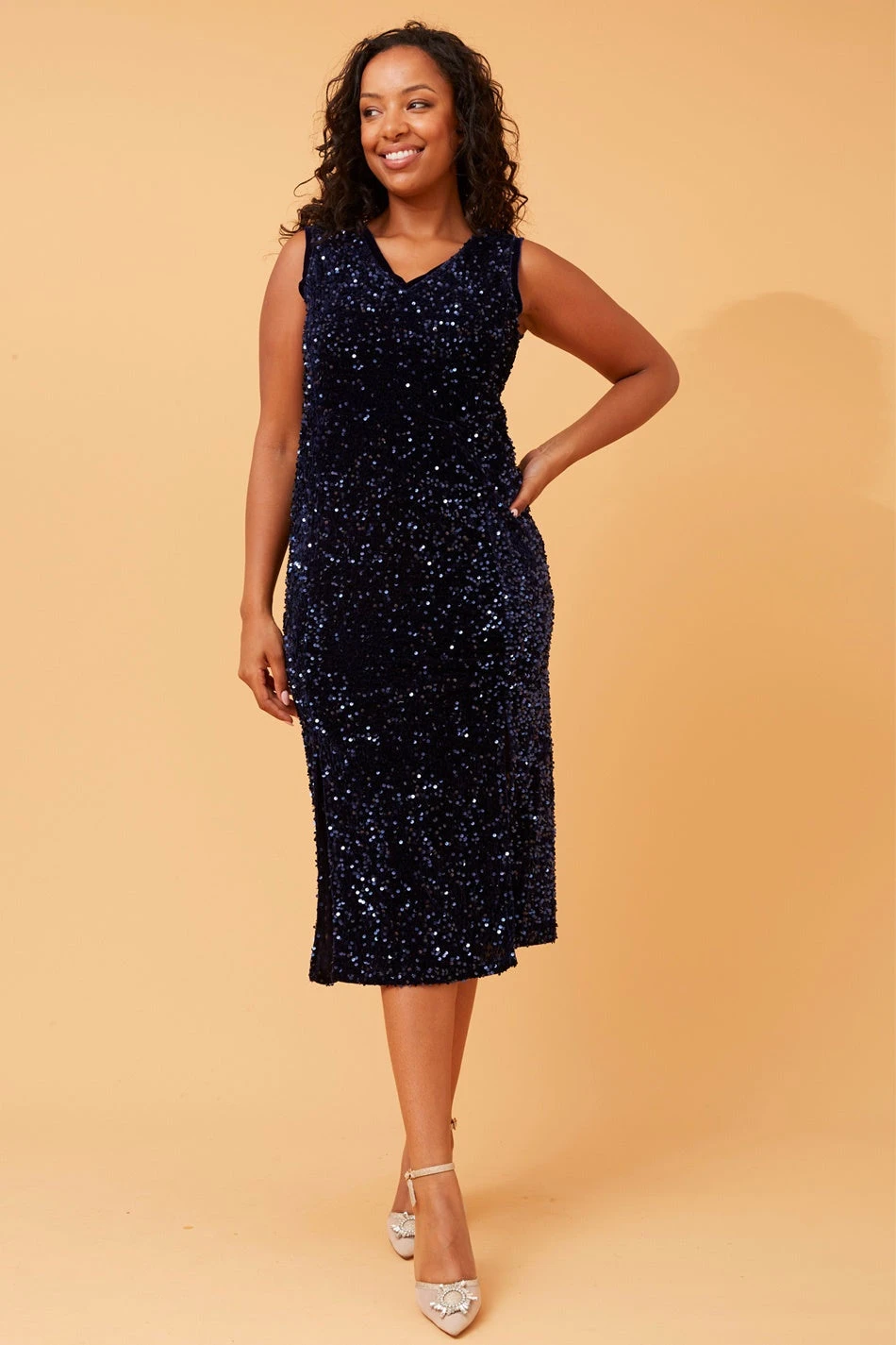Look stylish and elegant in our Mietta sequin split midi dress from our new bling collection. Style with your evening heels for an effortless and elegant cocktail look!