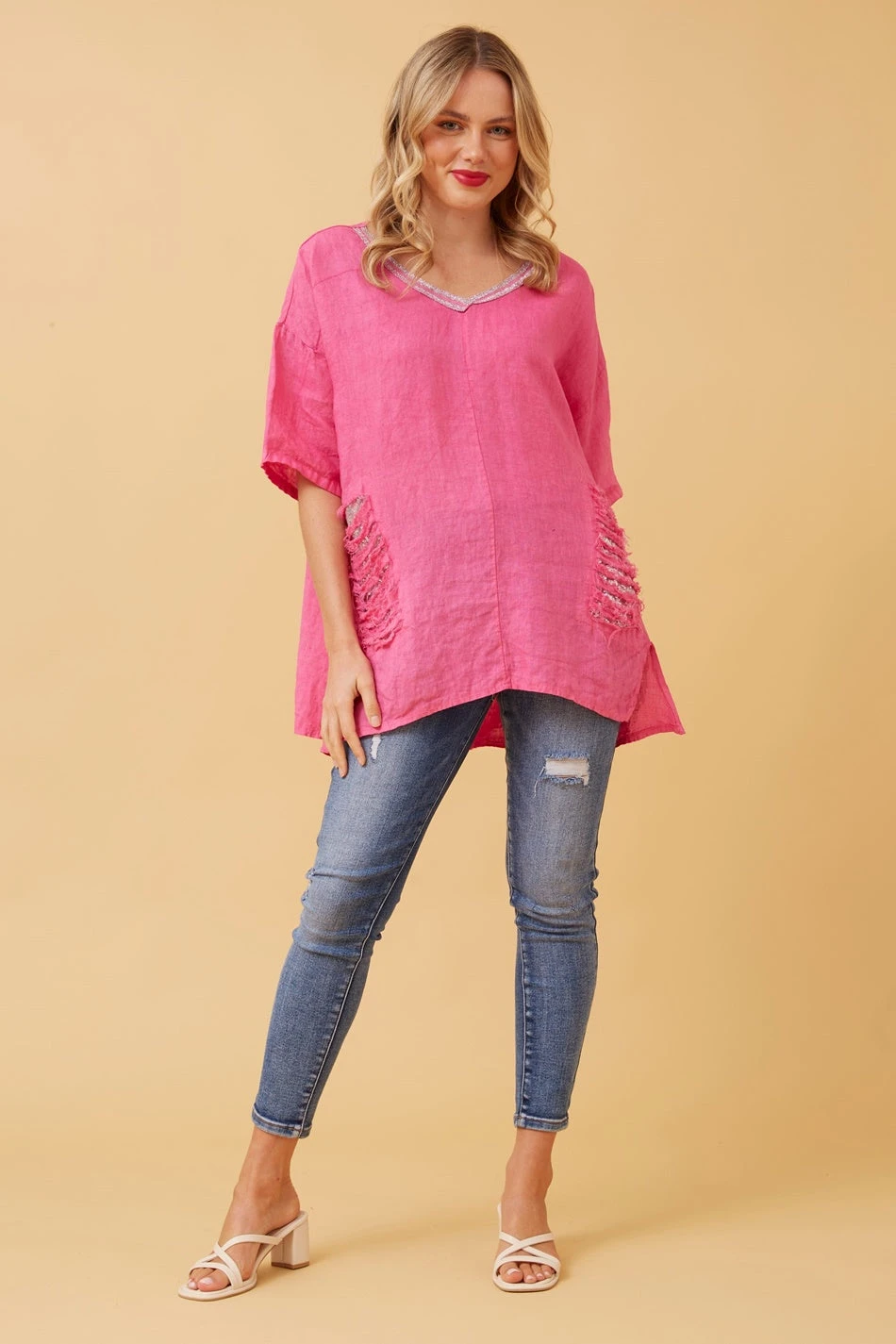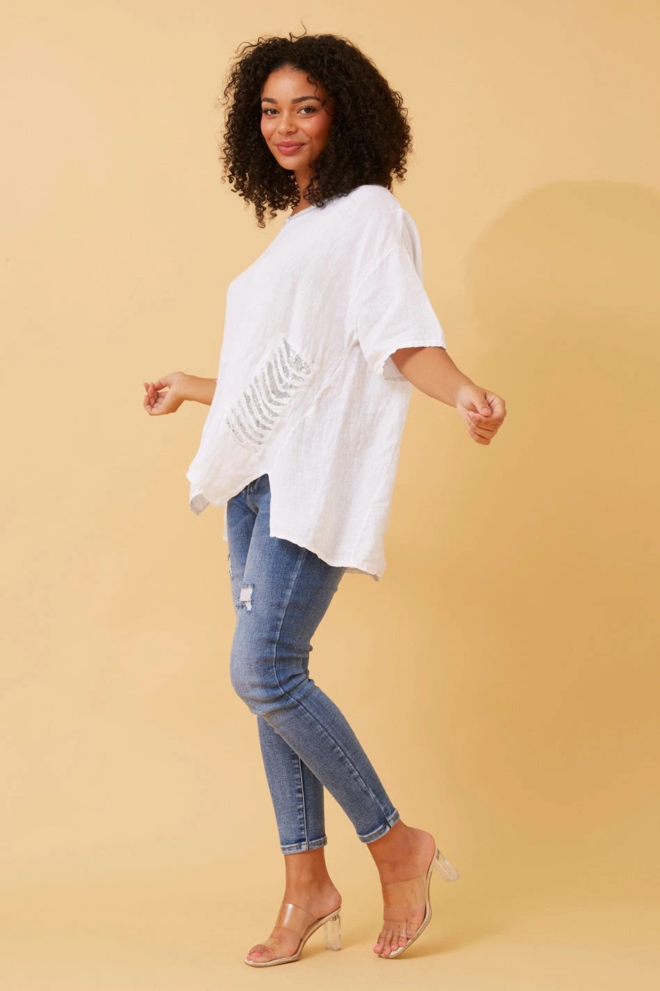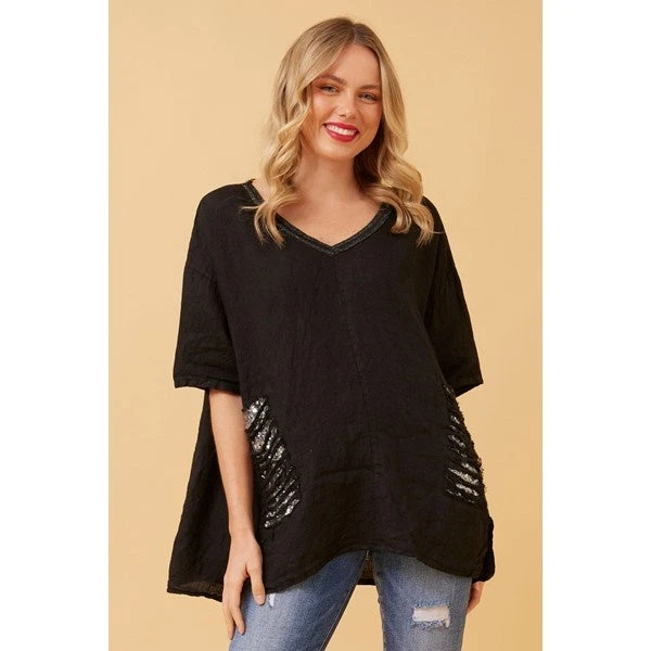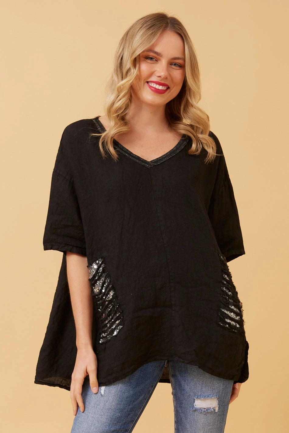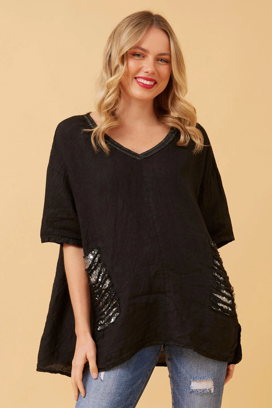 Feel stylish and comfortable in this sequin patch top with glitter trim neckline detailing. Easy to style with everyday jeans , tuck in shorts or pair with comfy leggings.