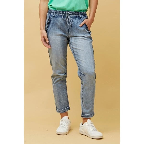 Relaxed and comfortable these mid wash denim joggers are a must have this season. Features an elasticated waistband with adjustable drawcord, mock zipper stitch detail and functional front zip pockets. Style with your favorite tee and sneakers for an effortless casual look.