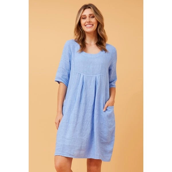 The 3/4 sleeves offer a stylish and versatile look, making it suitable for various settings. Additionally, the dress is thoughtfully designed with two side pockets, adding a practical and casual element to the ensemble.Â