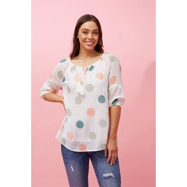 Stay comfortable and stylish this season in this lace detail peasant top. Easy to style with jeans or shorts for a cool and casual look!