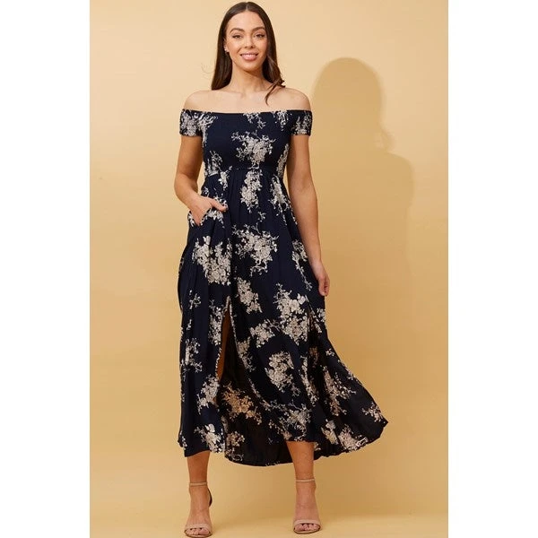 Bare your shoulders in this stunning floral maxi dress with a shirred bodice. The ditsy floral print is rocking the festival look with a subtle slits on both sides of the skirt bringing freedom of movement. Grab a straw hat and sandals and enjoy your day off.