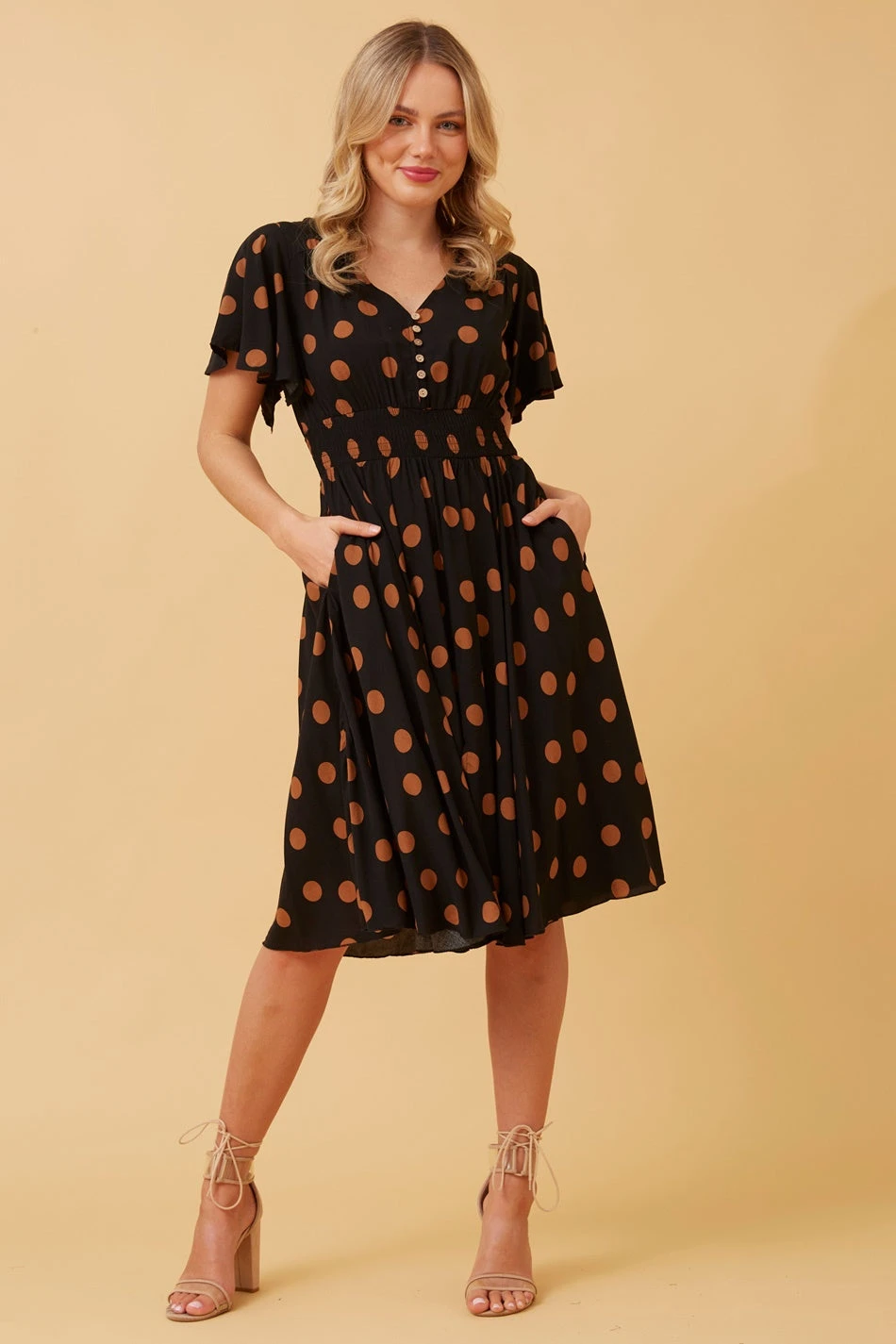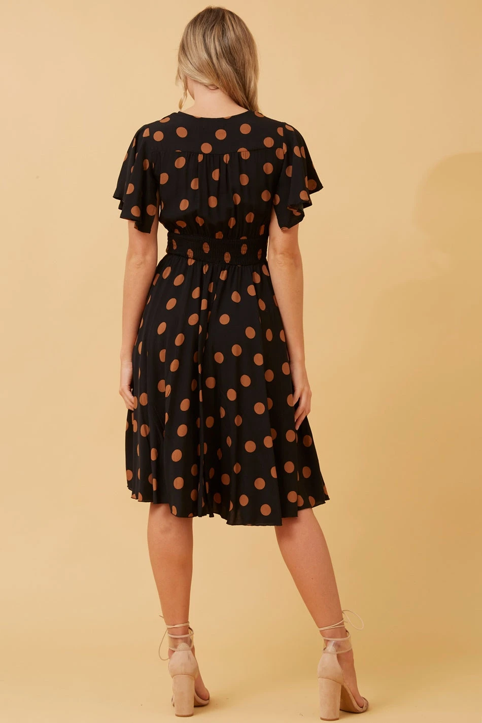 Channel effortless vibes with this gorgeous short dress made in an all over polka dot print. This dress is a relaxed in fit and can be worn with your favourite sandals for a casual daytime look.