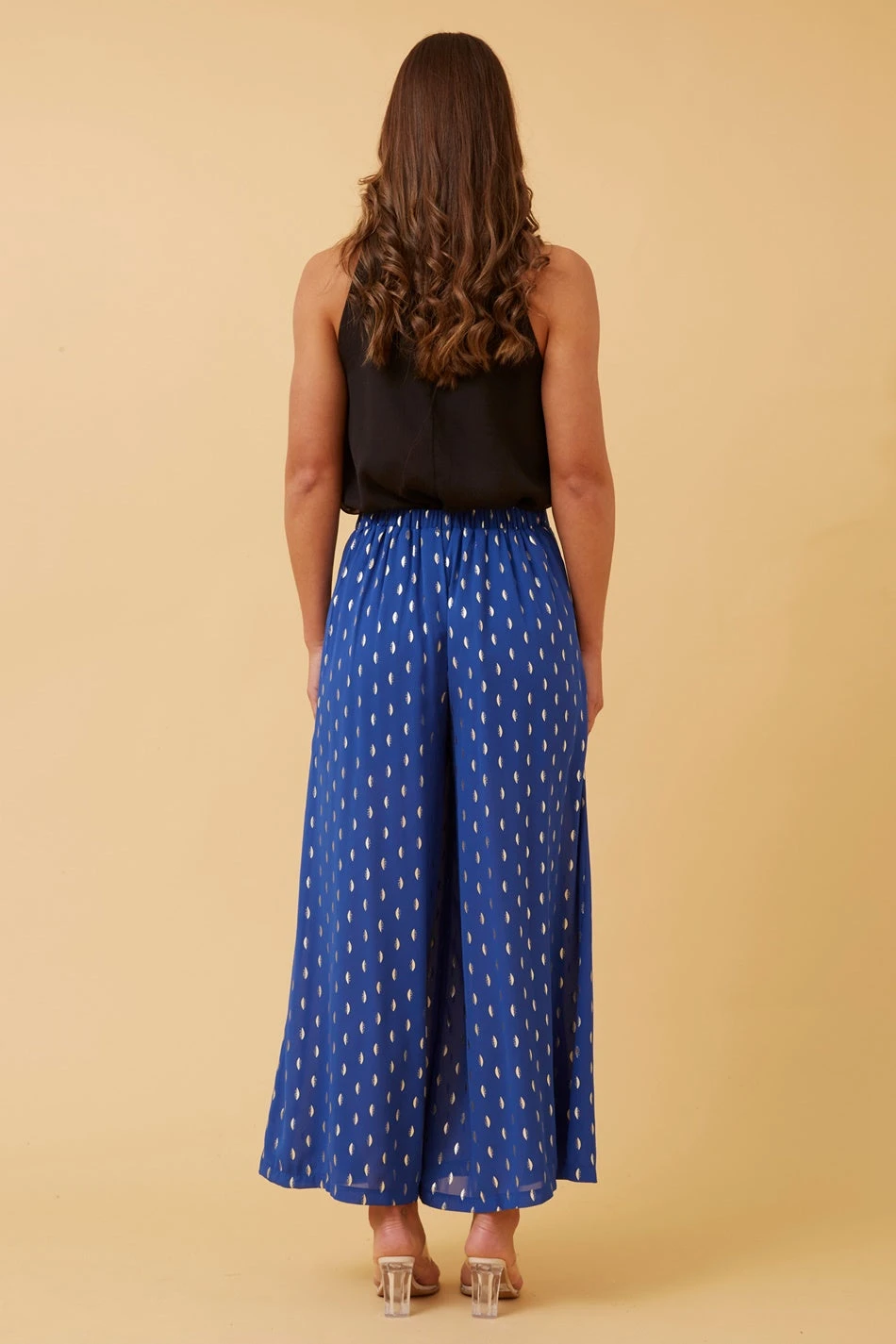 Make a style statement with these palazzo pants that feature foil print, zip and elasticated waist. Work It – Pair with a silk front silk kurta and heels to look hot.