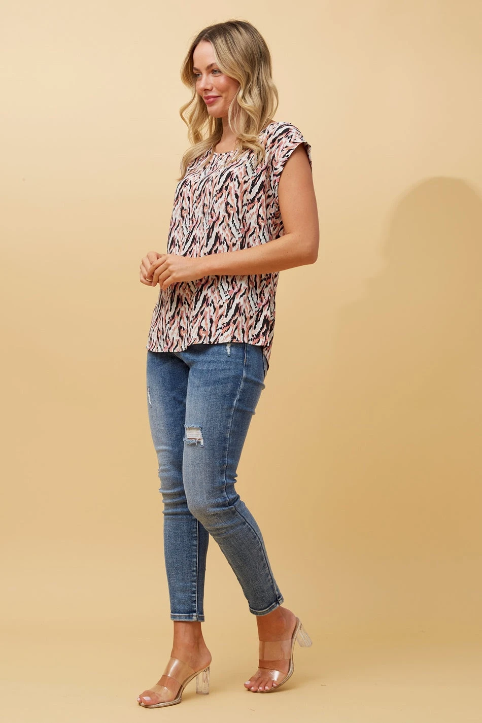 A distinctive print with a timeless appeal, this abstract print shell top is uncomplicated and easy to style with your skinnies this season! Pair with kicks for that cool look or heels for an elevated office look!
