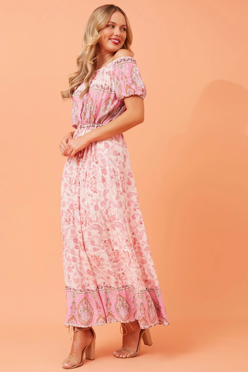 This feminine dress is a great warm-weather piece. The fabric is lightweight and breathable, and the off shoulder style is breezy and oh-so comfortable. Throw on this easy style with your favorite sandals and you’re ready to go.