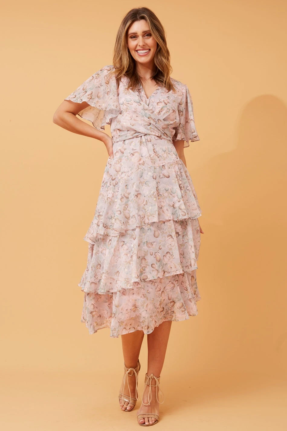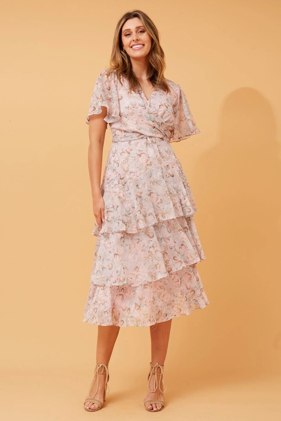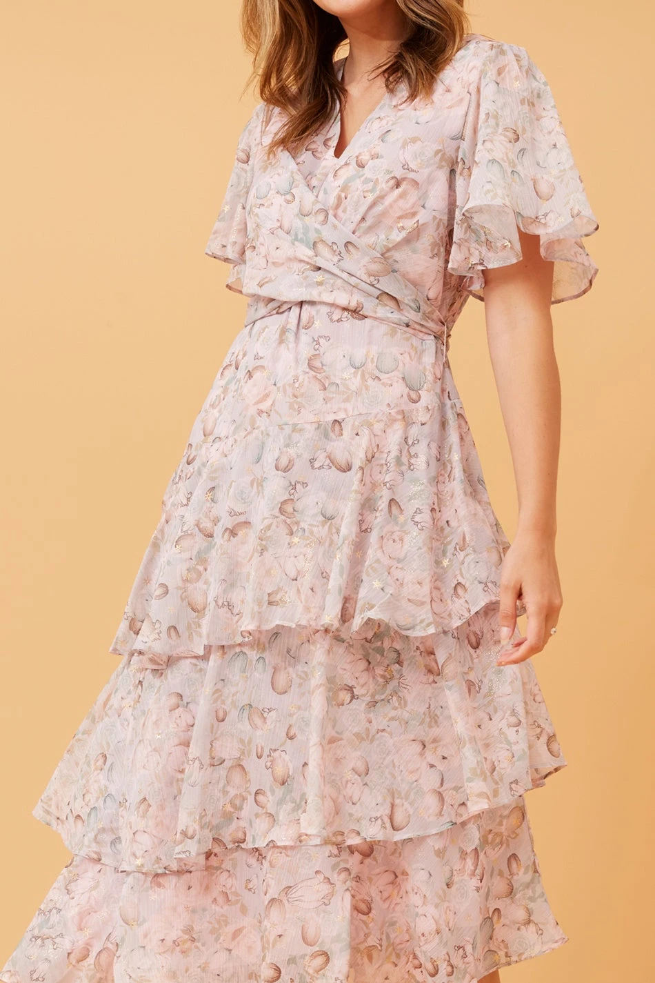 This delightful dress boasts a lively floral print adorning tiered layers, creating a whimsical and romantic aesthetic. The short sleeves add a touch of playful charm, while the wrap-around waist tie allows you to define your silhouette with grace.